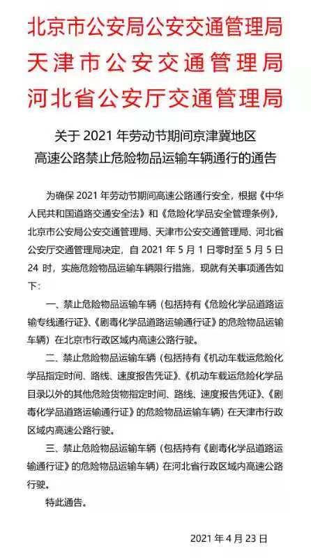 為確保2021年五一勞動節期間高速公路通行安全,根據《中華人民共和國道路交通安全法》和《危險化學品安全管理條例》,4月23日,北京市公安局公安交通管理局、天津市公安交通管理局、河北省公安廳交通管理局發布《關于2021年勞動節期間京津冀地區高速公路禁止物品運輸車輛通行的通告》,通告決定,自2021年5月1日零時至5月5日24時,實施物品運輸車輛限行措施。